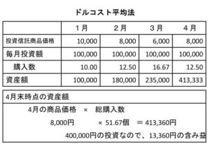この表の場合、投資商品が4月末の時点で、51.67個購入できているので、資産額は、413,360円(8,000円×51.67個)となります。