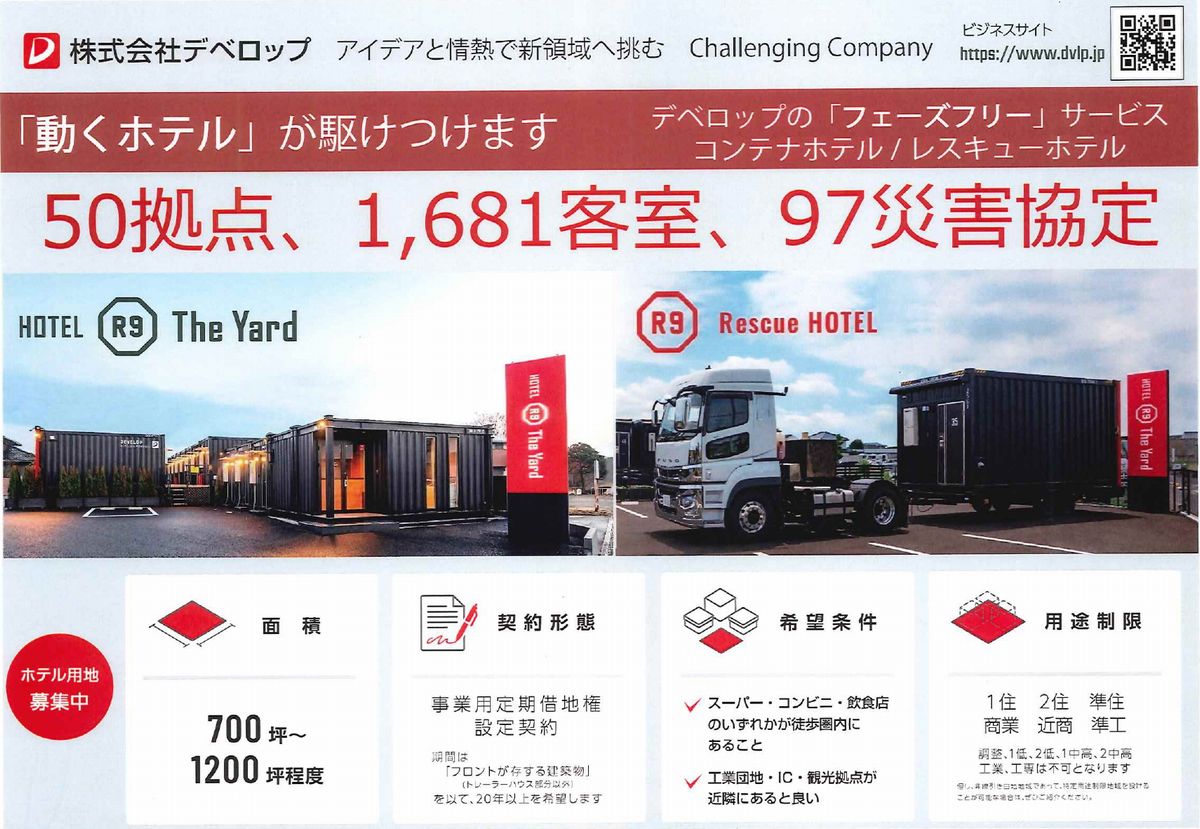 コンテナホテル、レスキューホテル用地を探しています 必要面積は700坪から1200坪 借地料は、坪500円から700円 1,000㎡(一反)あたり、15万円から20万円 25年から30年の事業用定期借地権設定契約を締結予定 希望条件 都市計画線引き区域、幹線道路沿い、コンビニ、スーパーの近く等 適地がありましたら当社へ 53-8463